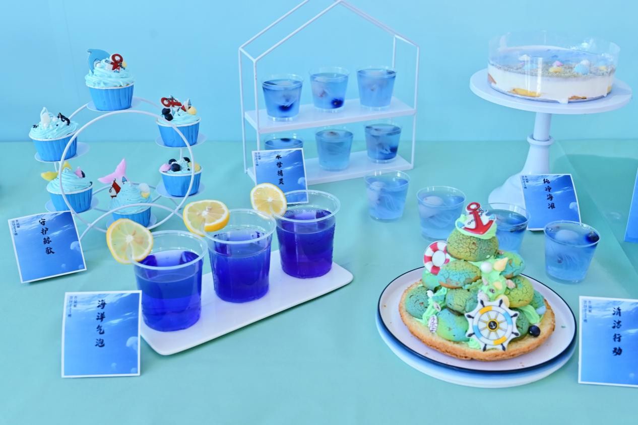 作品以“守护海洋就是守护我们唯一的家园”为主题,围绕“蔚蓝守护者,甜蜜行动”精心制作的甜品台。