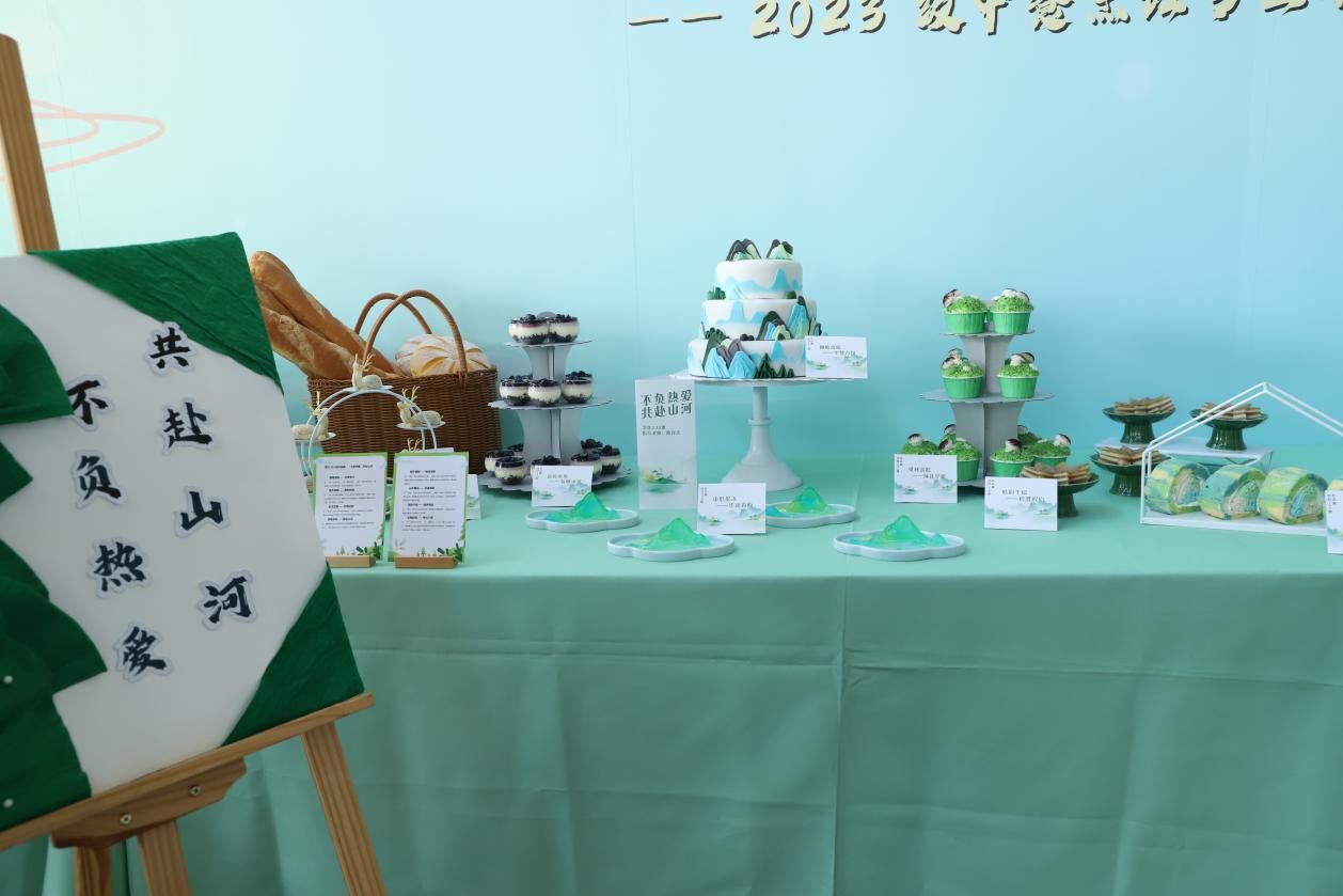 作品围绕“绿水青山就是金山银山”的理念,以“不负热爱,共赴山河”为主题,精心打造甜品台。